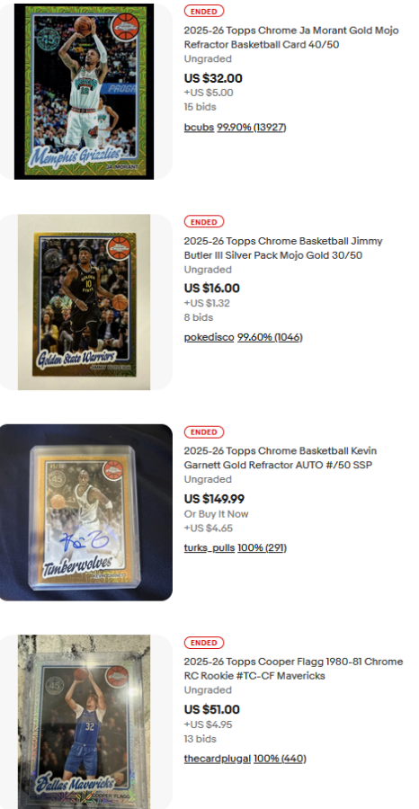 I only had the Brooks Barnhizer Gold Mojo /50s to see what low end rookies are going for. The jersey # /50 went for $16 when the irrelevant number went for $30 lol, so these are all over the place. Probably someone with FOMO on the bigger sale dunno